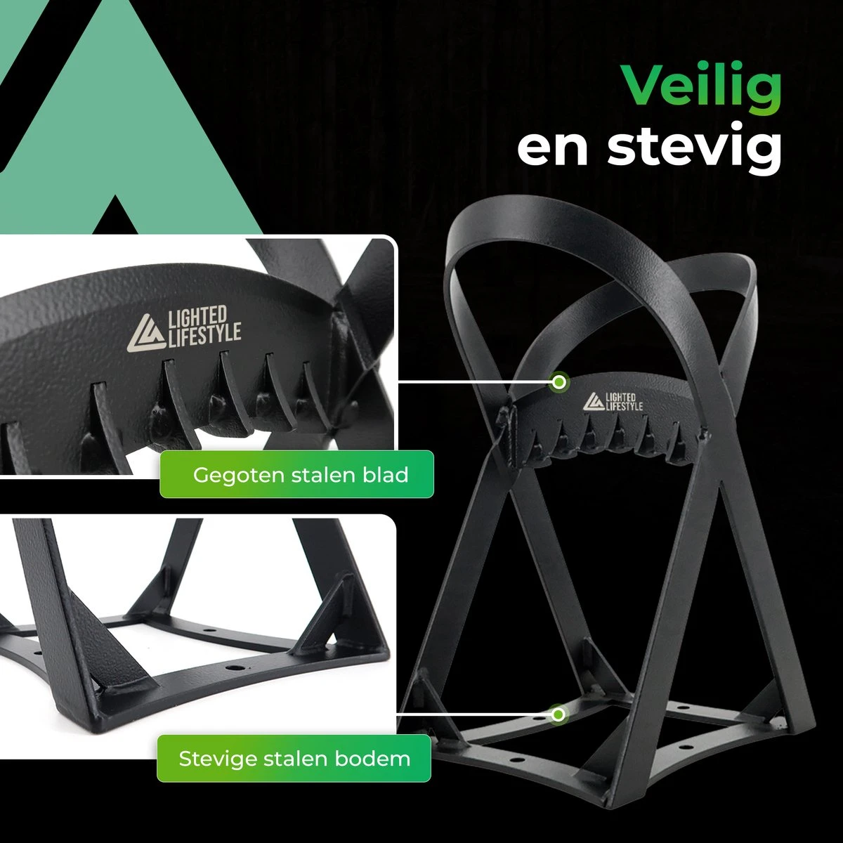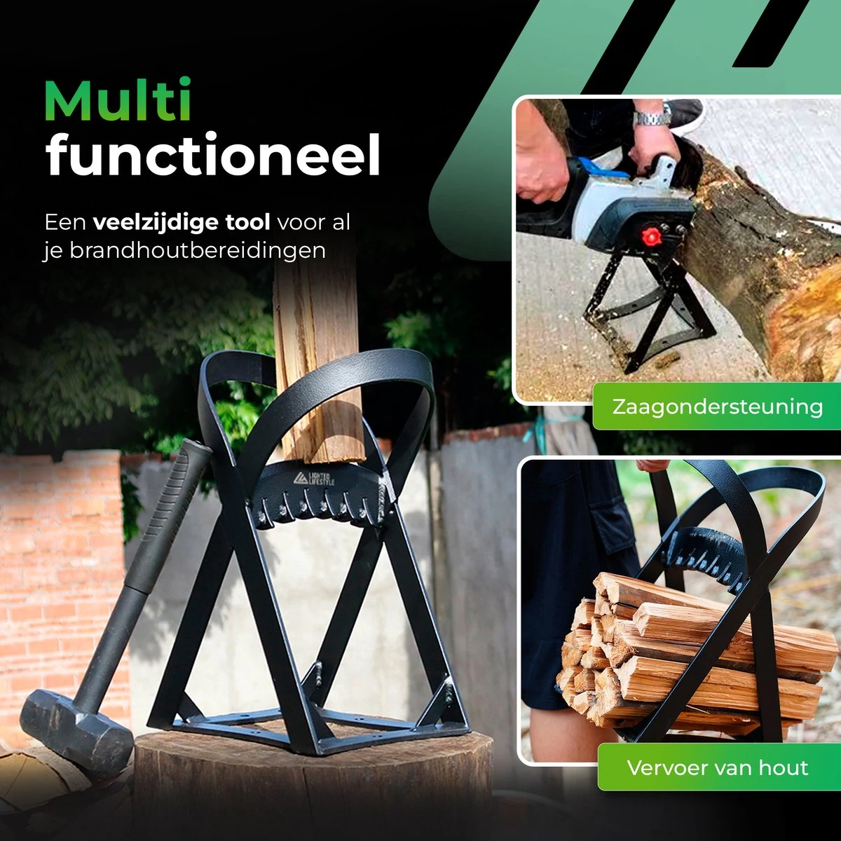 Slim 3 in 1 design – De Lighted Lifestyle houtklover is niet alleen ontworpen voor veiligheid, maar ook voor gebruiksgemak. Het compacte formaat maakt het gemakkelijk om op te bergen en te vervoeren. De houtsplijter kan worden gebruikt om gekloofd hout te vervoeren naar je vuurplaats, maar ook om grote stammen op te laten leunen om deze vervolgens kleiner te zagen.