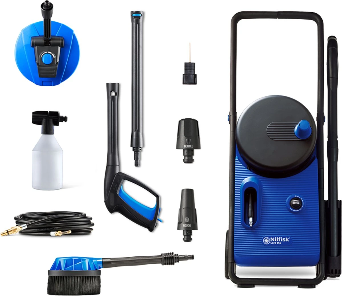 De Nilfisk Core 150 Power Control PAD blinkt uit in gebruiksvriendelijkheid en schoonmaakkracht. Met een draai aan de knop op de hogedrukreiniger past u de druk aan voor de verschillende schoonmaaktaken. Op de hogedrukreiniger zit een duidelijke afbeelding, zodat u exact weet welke druk en welk spuitstuk u voor welke klus moet gebruiken. Wel zo veilig en handig! Bijgeleverd zitten een terrasreiniger, wasborstel en een rioolslang.